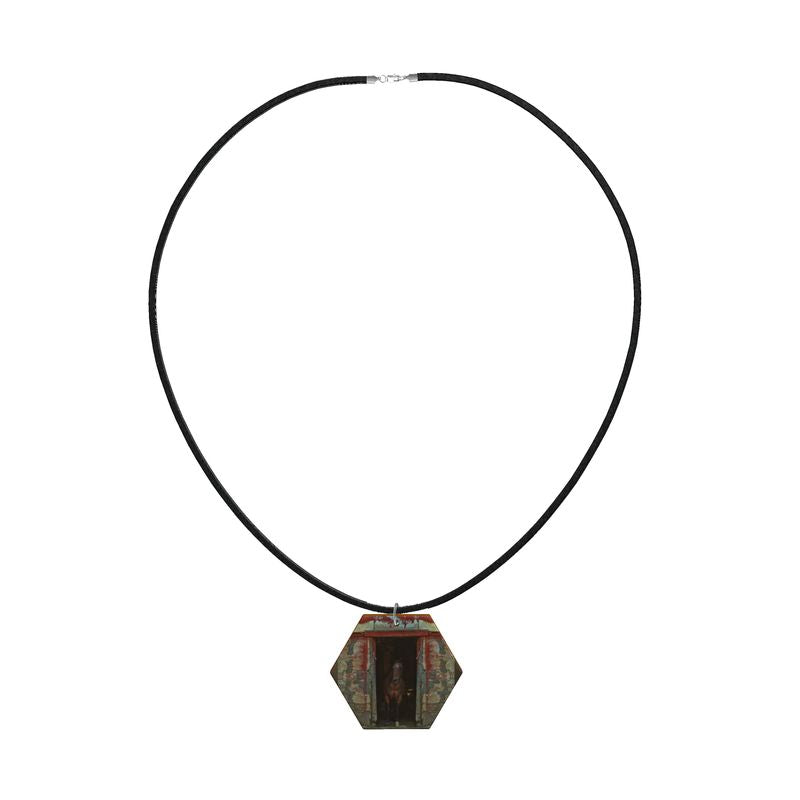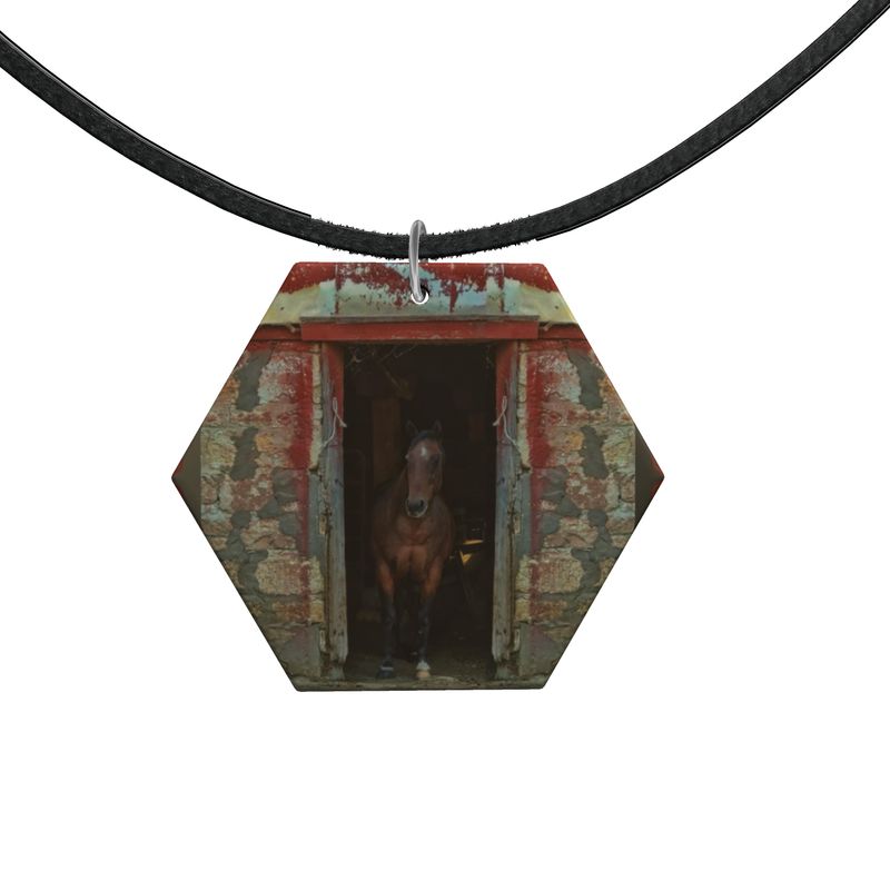 Horse in Red Barn by JVH Hexagon Wood Necklace