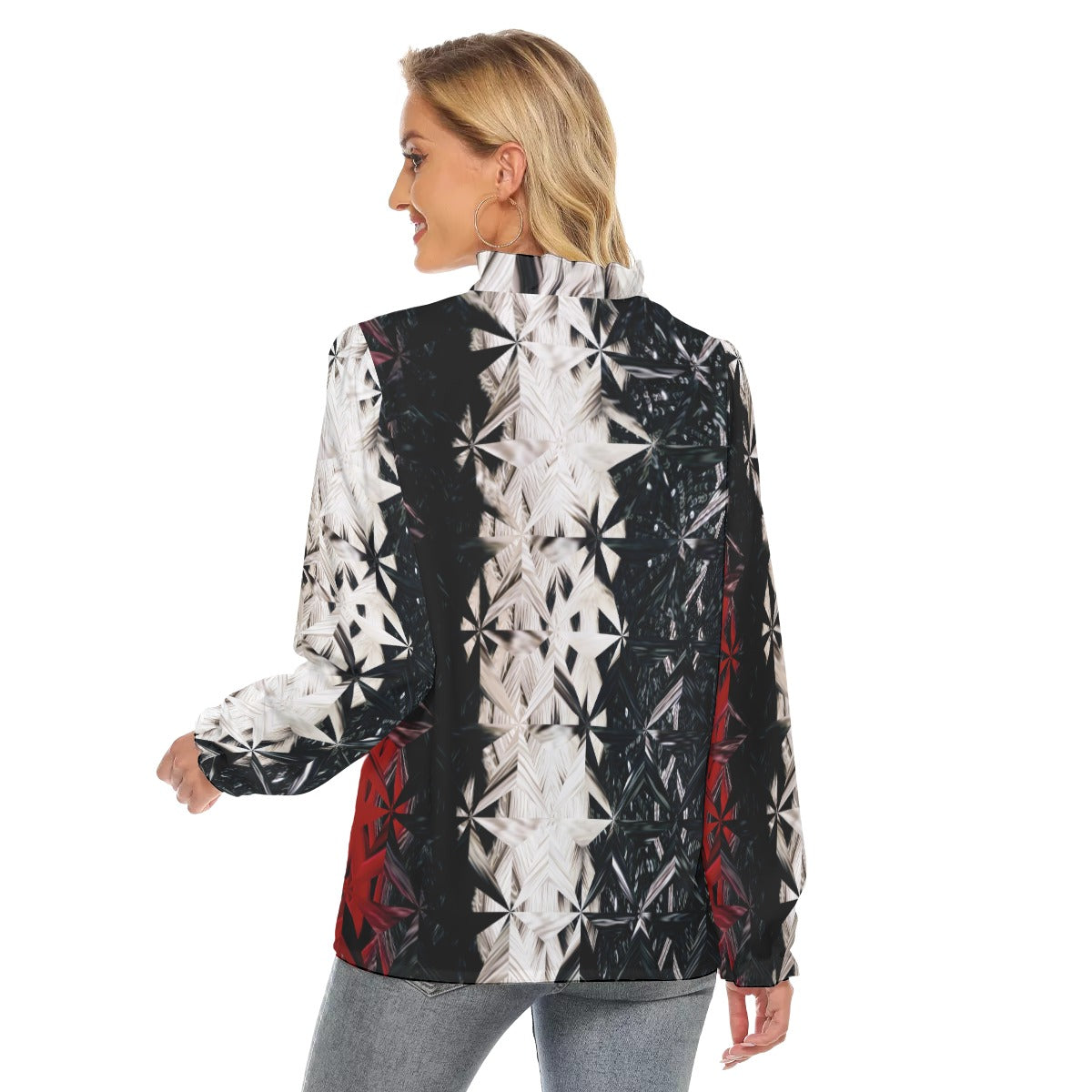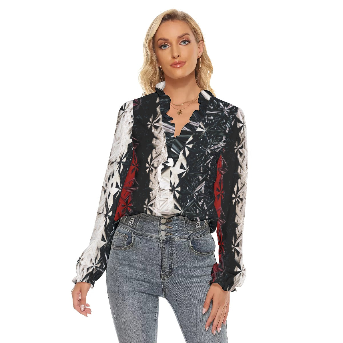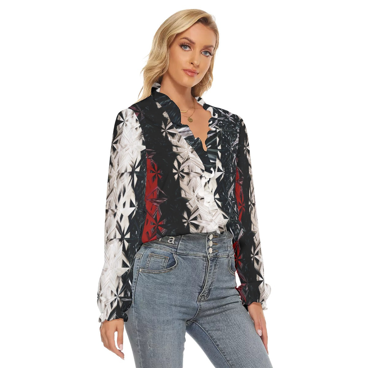 Women's Pleated Collar V-neck Shirt Red White & Black Abstract