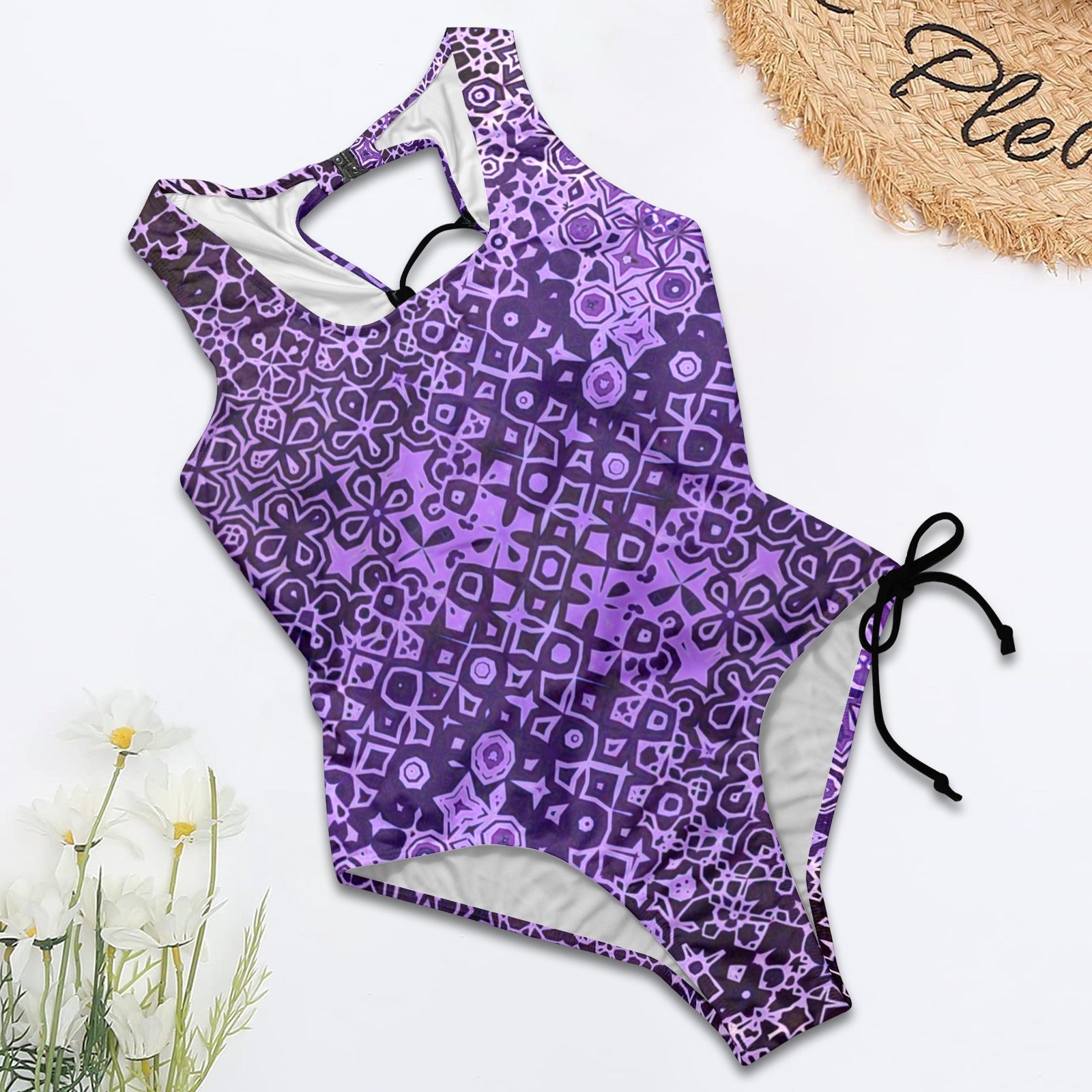 Tie Back Lace Up One Piece Swimsuit Purple and Black Abstract