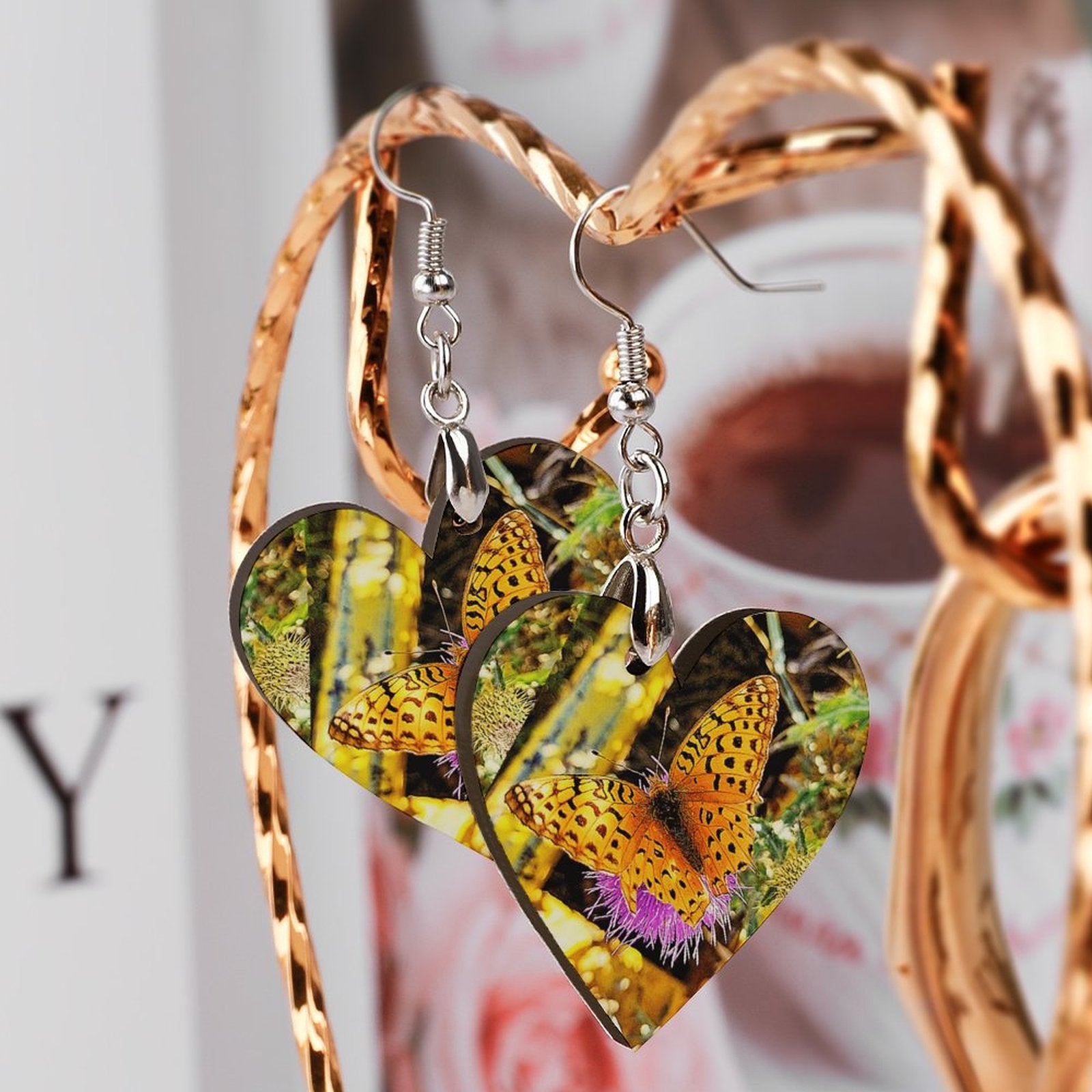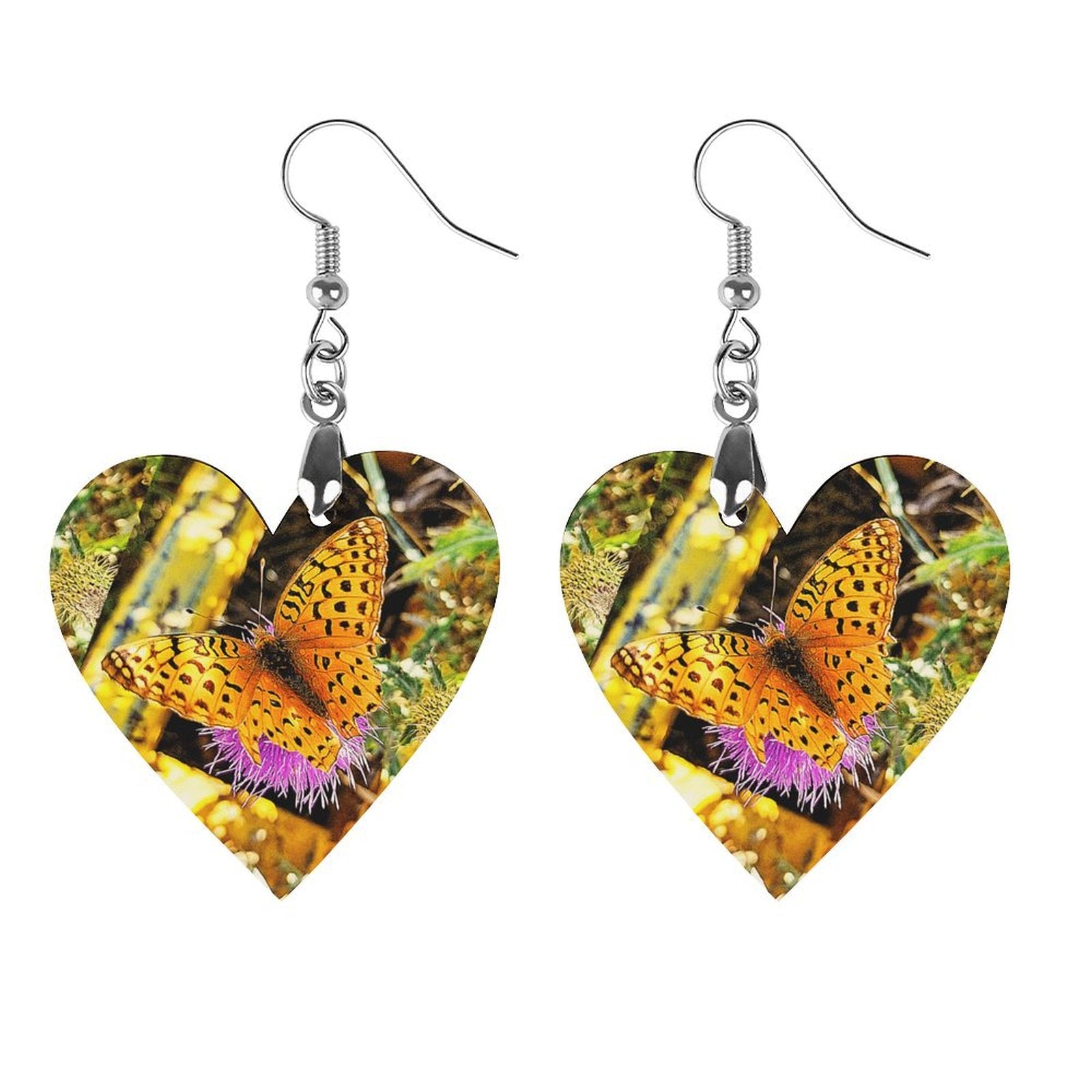 • Wooden Heart Earrings Butterfly on Thistle