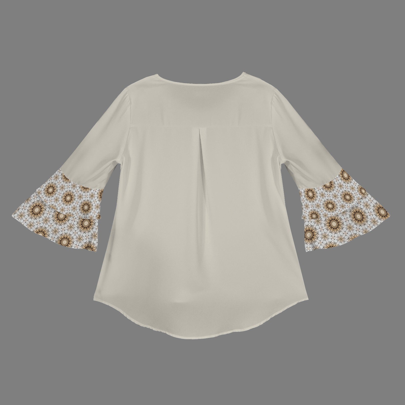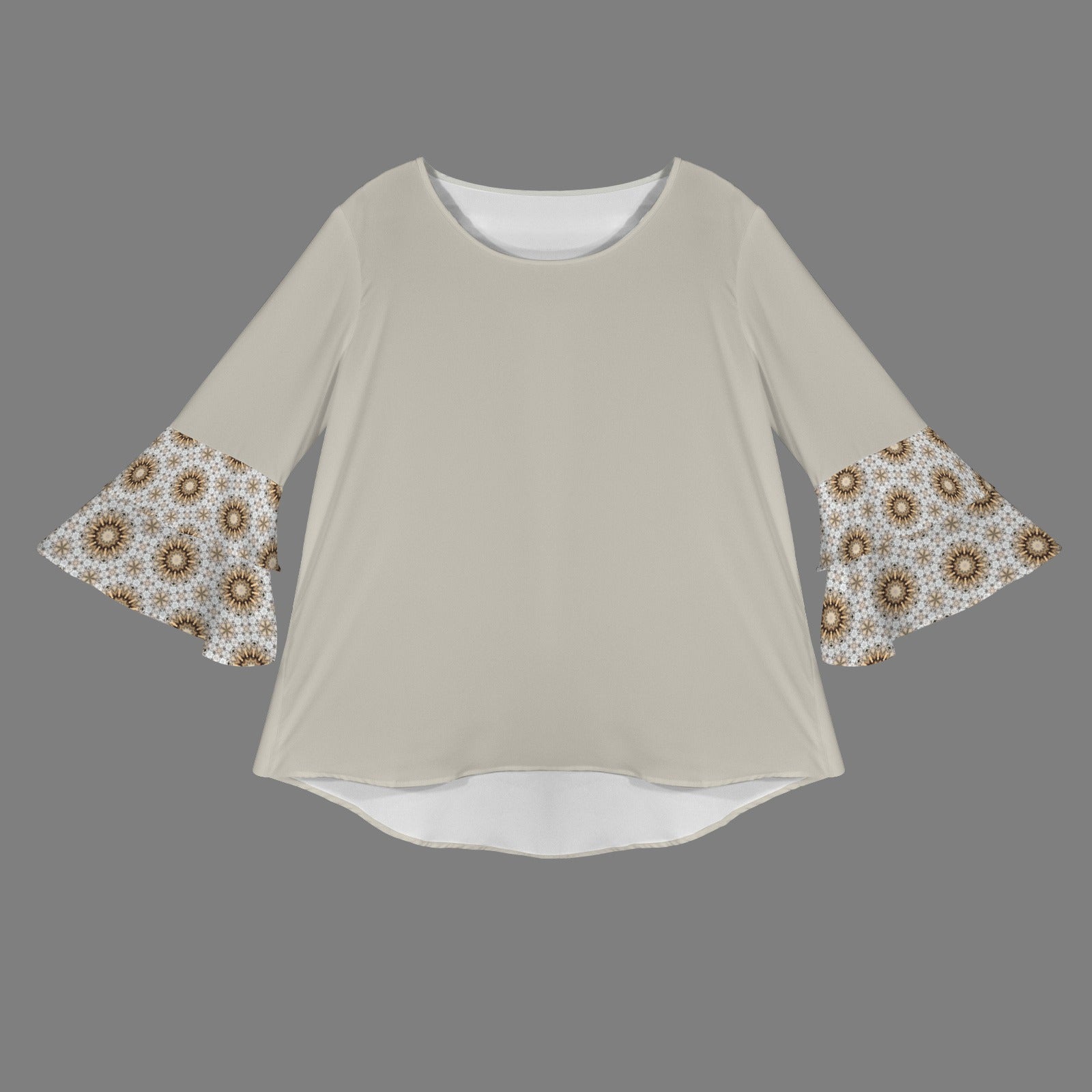 Layered Flare Sleeve Blouse Shimmering Feathers Gold Taupe Gray
