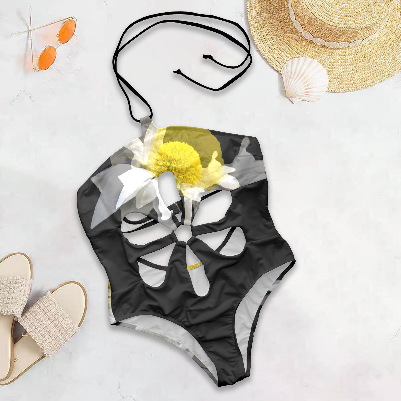 Flower Cut Out One Piece Swimsuit Daisy Watercolor Black