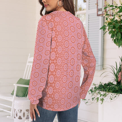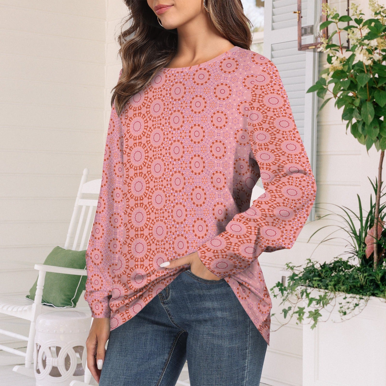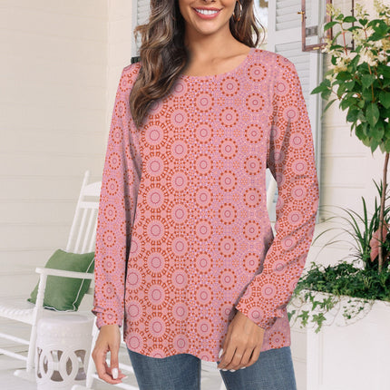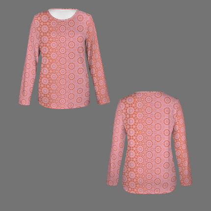 Long Sleeve Round Neck T Shirt Red Pink Geometric
