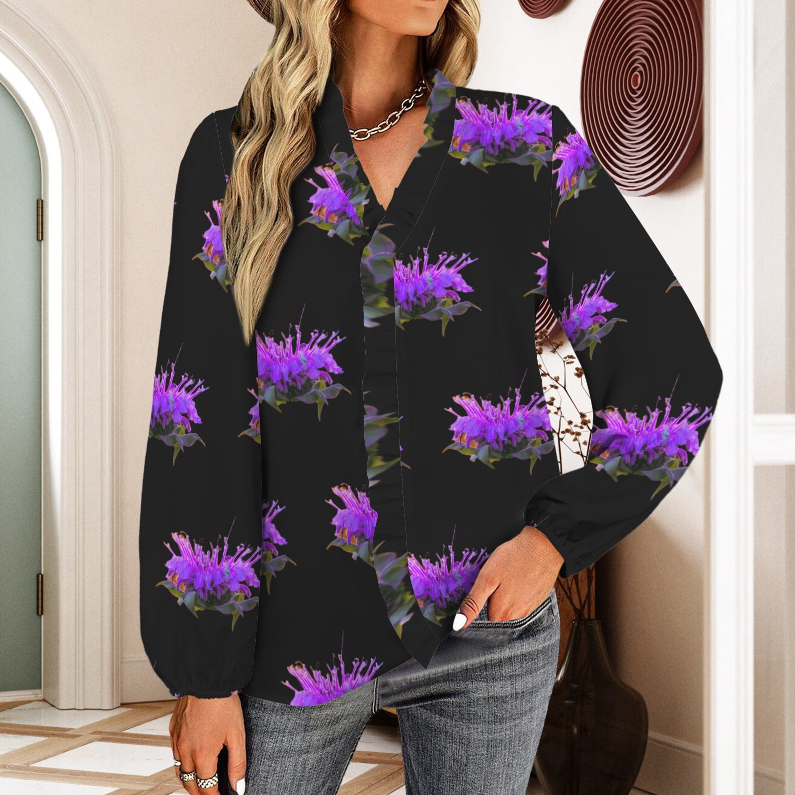 【Product Performance Characteristics】The Long Sleeve Ruffled Trim V Neck Shirt features a stylish and feminine design with ruffle details, a flattering V-neckline, and a comfortable fit, making it perfect for both casual and semi-formal occasions.