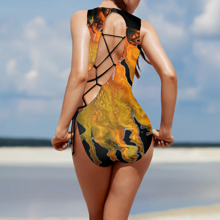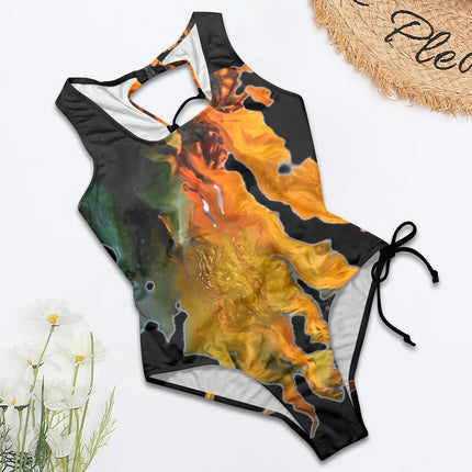 Tie Back Lace Up One Piece Swimsuit MIdnight Sunflower Black