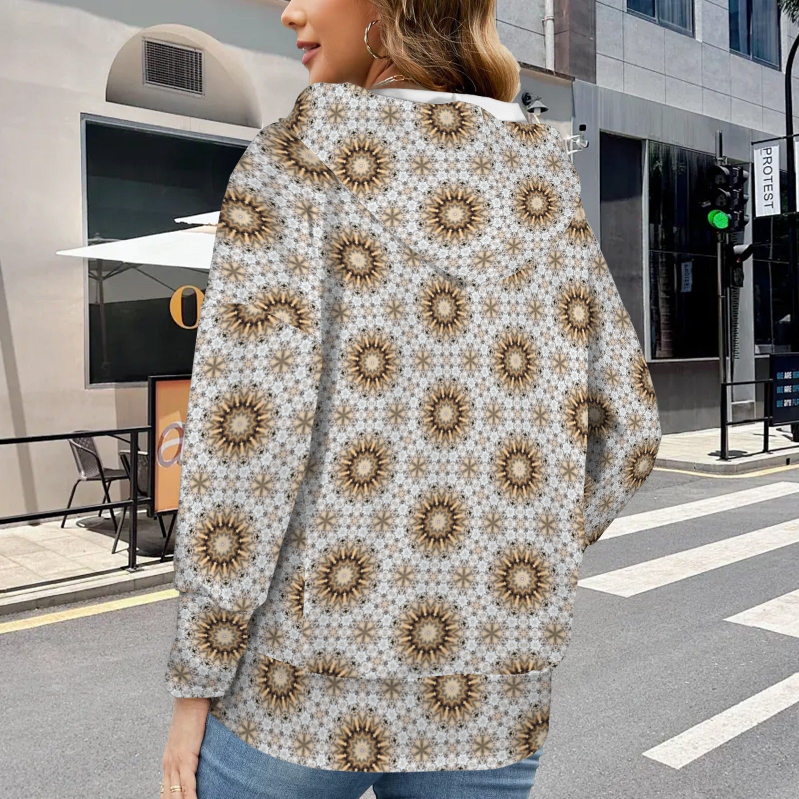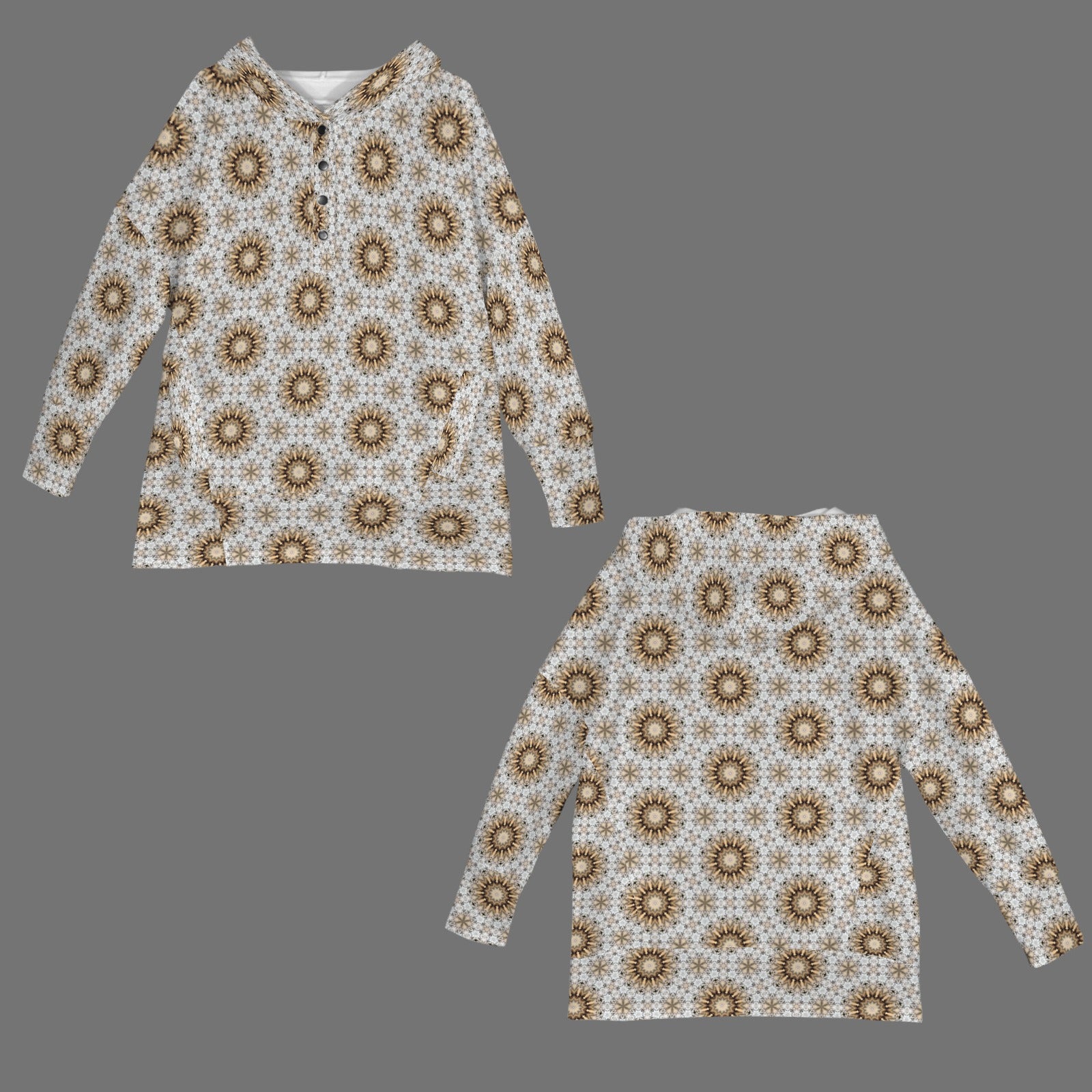 V Neck Pocket Hoodie Shimmering Feathers Gold Taupe Gray