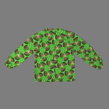 Long Slit Sleeve Blouse Brown Butterfly on Green