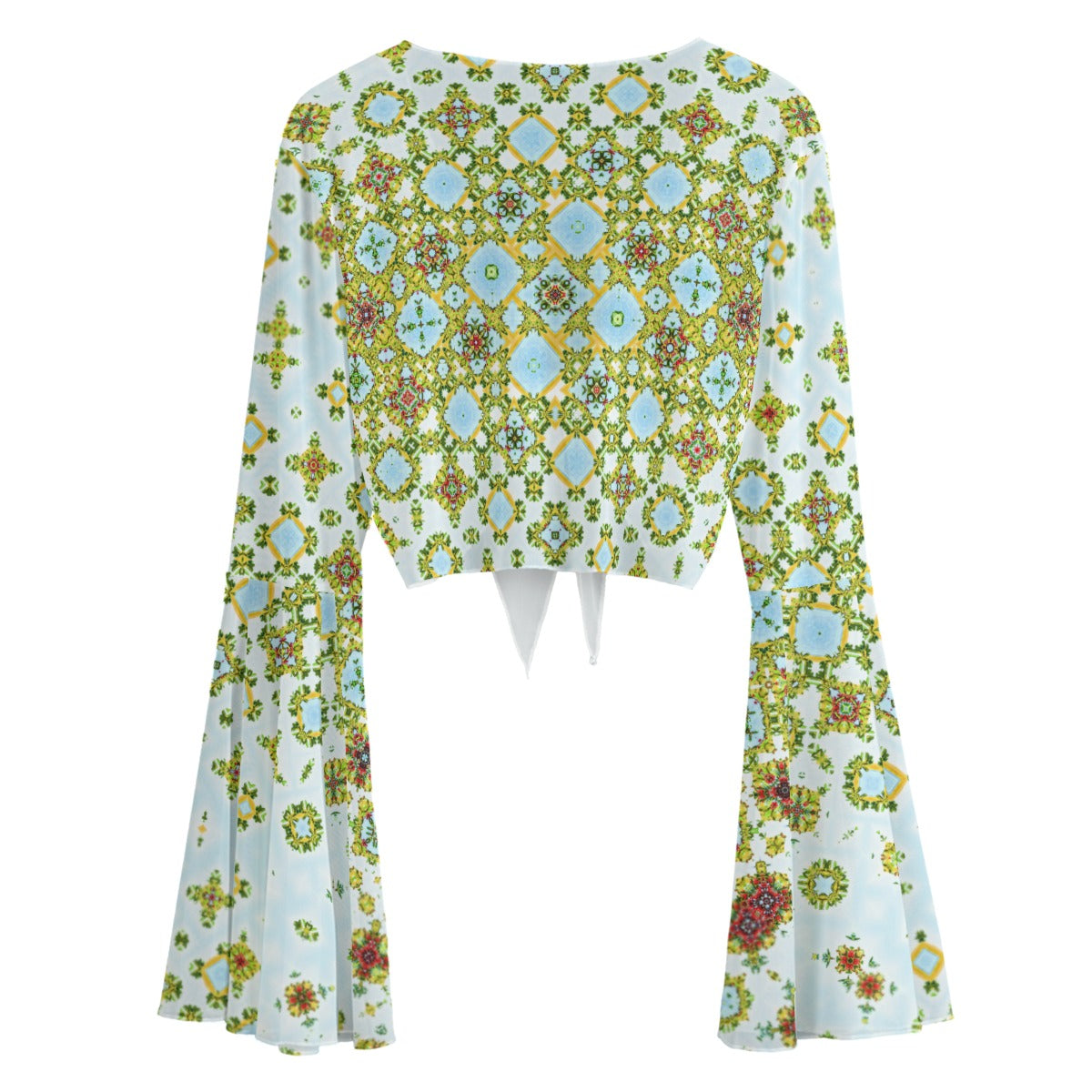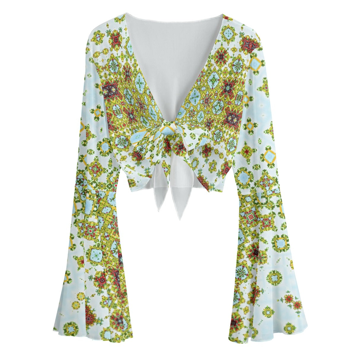 Ruffled Tie Front Cropped Blouse Buffalo Berries Red Green Blue Yellow