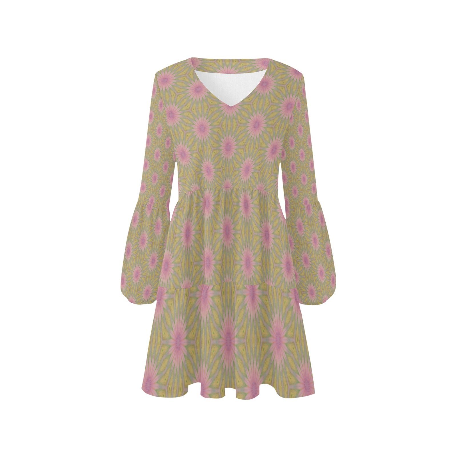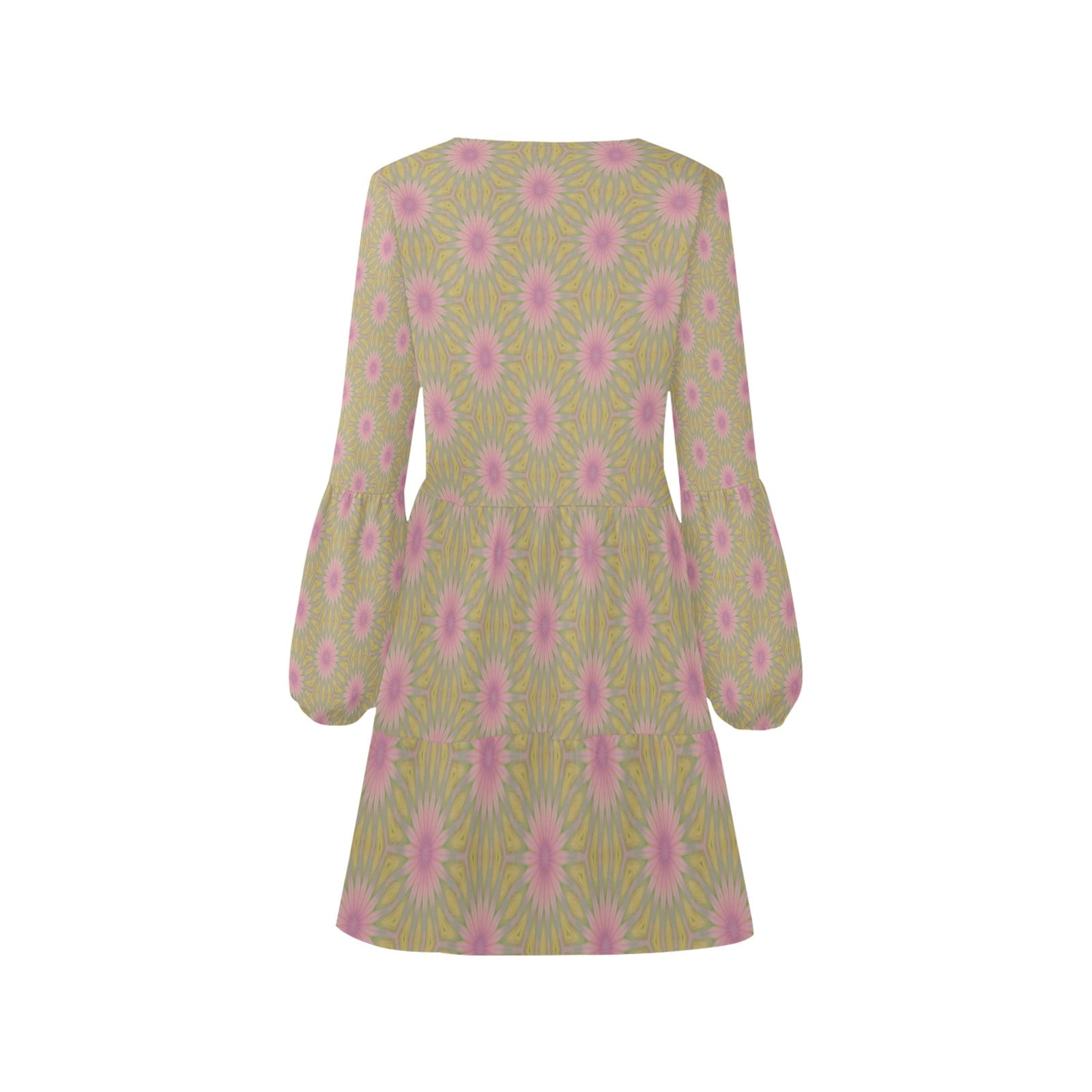 • V Neck Flowy Dress Pink Coneflowers Taupe